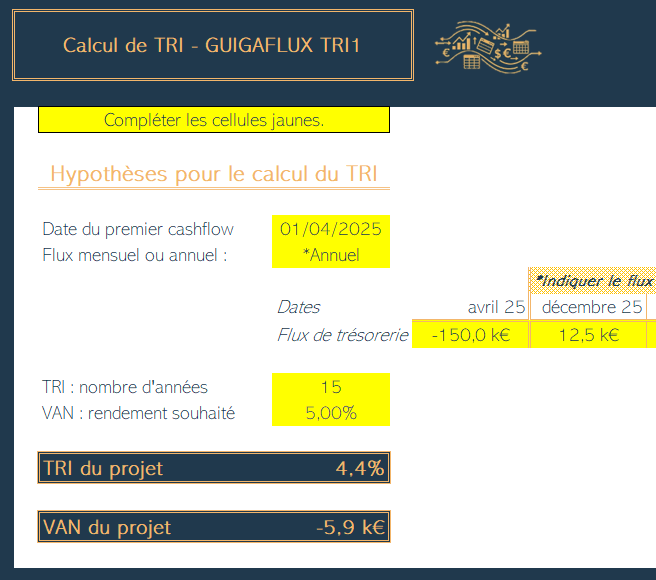 Le modèle GUIGAFLUX – TRI & VAN vous permet d’atteindre rapidement et facilement vos objectifs d’analyse, s’il s’agit pour vous d’avoir un TRI et une VAN fiables.
